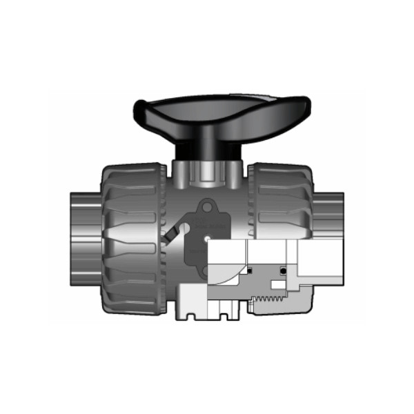 Műanyag 2-utas golyóscsap, EPDM tömítéssel. Lúgos, savas, sós közegek, ivóvíz és nagytisztaságú víz továbbítására.