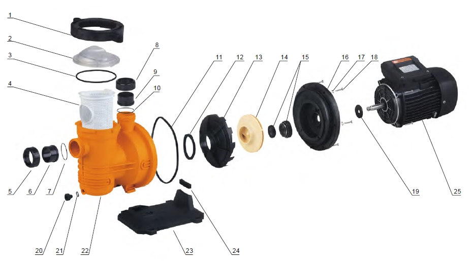 - Az üvegszál erősítéses, előszűrővel ellátott, polipropilén anyagú szivattyúház ellenáll az uszodatechnikai vegyszereknek.