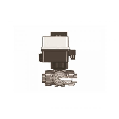 Műanyag 3-utas golyóscsap L-furattal, elektromos működtetéssel, EPDM tömítéssel, 90-240V AC 50-60 Hz. Lúgos, savas, sós közegek, ivóvíz és nagytisztaságú víz továbbítására.