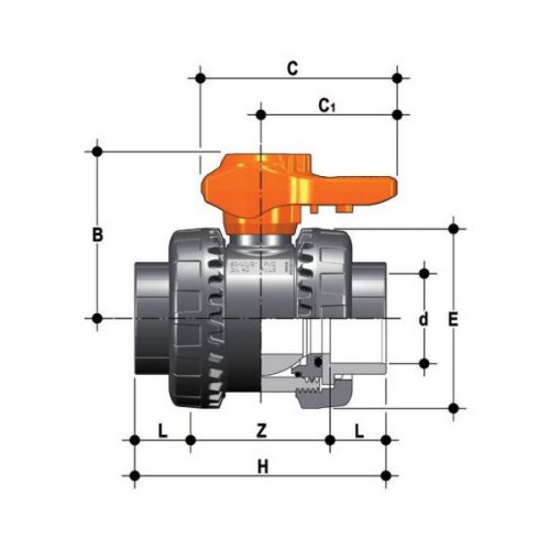Műanyag szabályozó golyóscsap, ahol a kézikar elfordításának arányában csökken az áramlási keresztmetszet, EPDM tömítéssel. Lúgos, savas, sós közegek, ivóvíz és nagytisztaságú víz továbbítására.